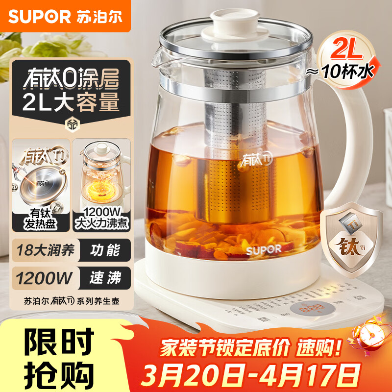 苏泊尔(SUPOR)2L大容量 养生壶烧水壶花茶壶电水壶电热水壶煮茶壶 0胶水有钛0涂层 304不锈钢滤网 SW-20YQ68C
