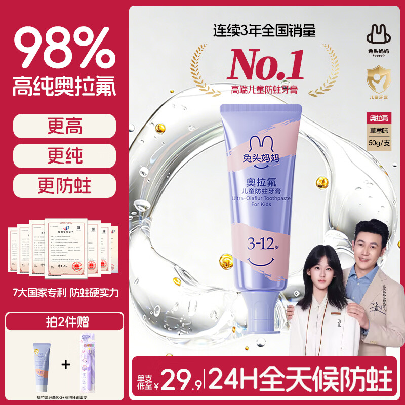 兔头妈妈高纯奥拉氟儿童牙膏防龋防蛀牙草莓味不辣口3-12岁含氟50g