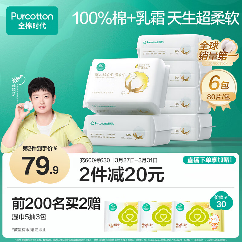 全棉时代【孙颖莎同款】婴儿纯棉棉柔巾超柔乳霜洗脸巾成人可用80抽*6包
