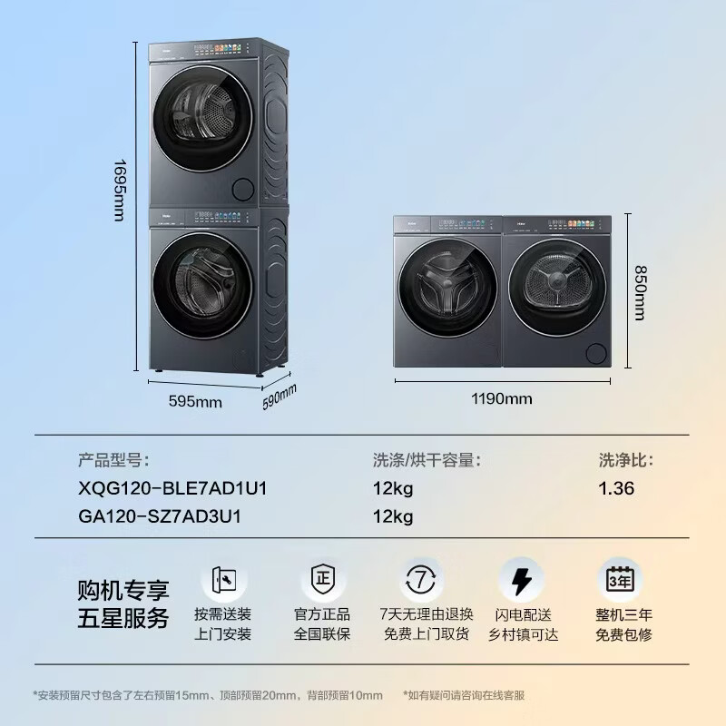 海尔(Haier)云溪5.0 AWE同款 D1洗烘套装 12KG大容量滚筒洗衣机全自动+双擎热泵烘干机 国家补贴 7AD1+7AD3