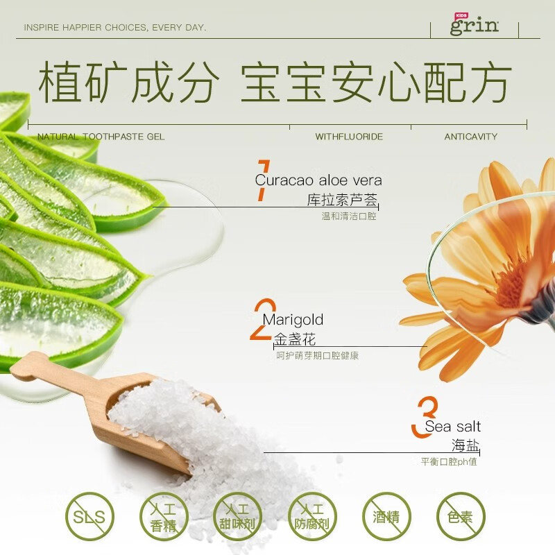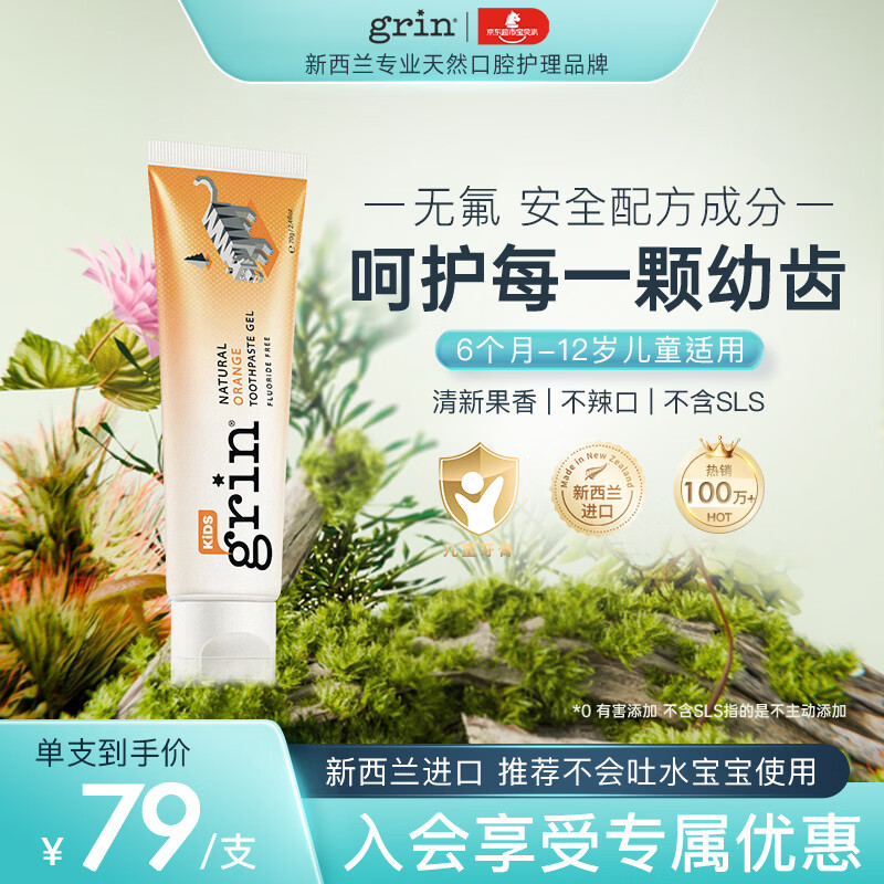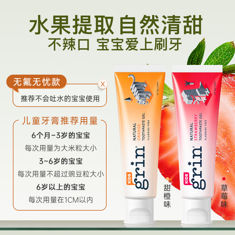 grin宝宝儿童牙膏无氟不含氟防蛀0-3-6岁婴幼儿牙膏70g甜橙味