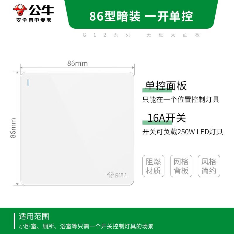 公牛(BULL)开关插座 G12系列 一开单控开关大面板开关G12K111 象牙白 暗装