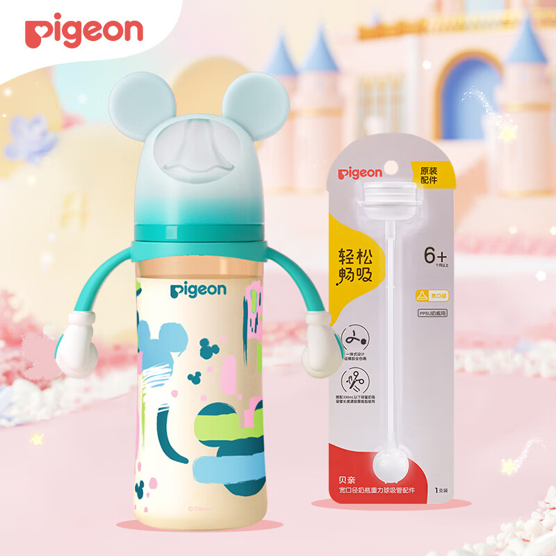 贝亲(Pigeon)PPSU双把手奶瓶套组 (330ml奶瓶 LL号奶嘴 重力球吸管配件) 9月+