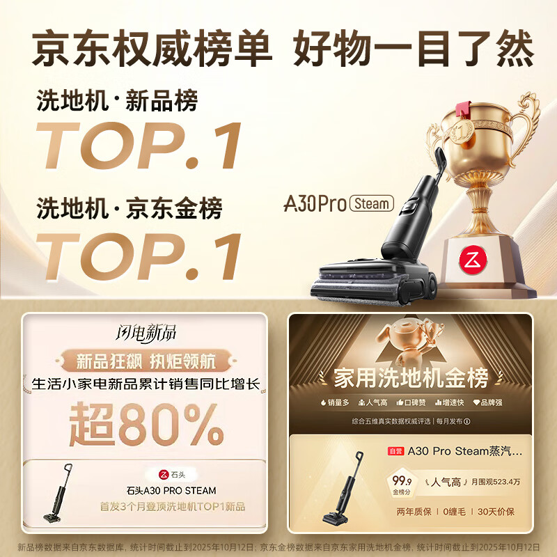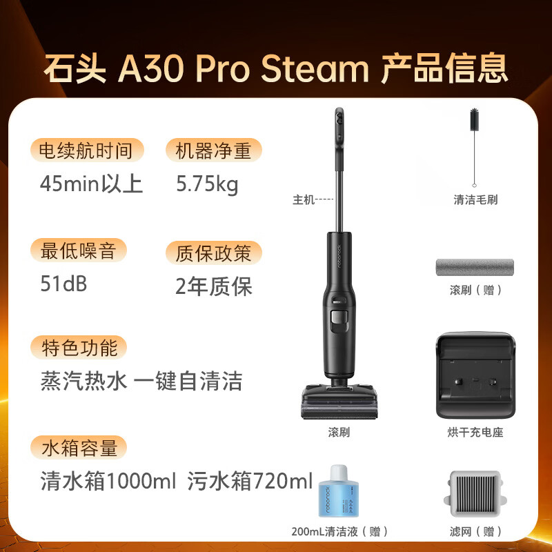 今日推荐:石头A30 Pro Steam【160℃蒸汽】86°C热水长续航全向助力蒸汽洗地机0缠毛0异味吸拖一体扫地机