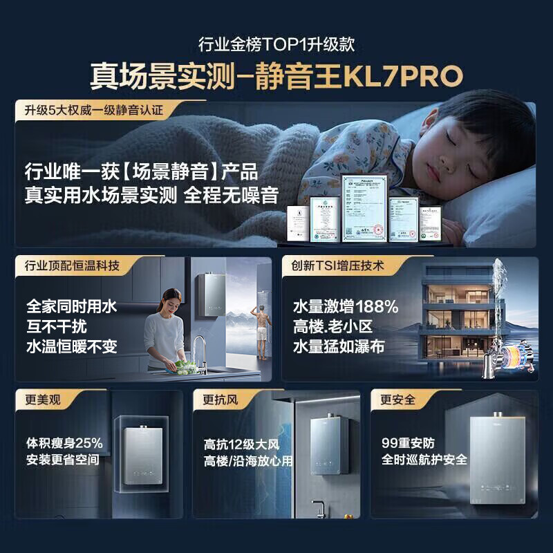 海尔【静音王KL7PRO】16升 真场景实测真全程静音 一级恒温 增压大水量 天然气燃气热水器以旧换新