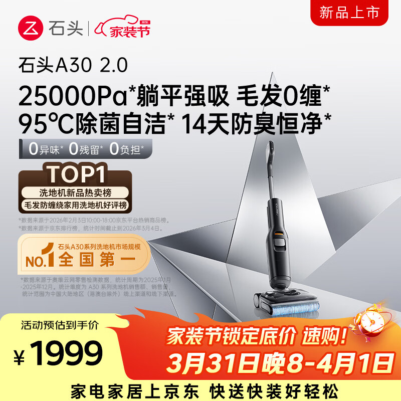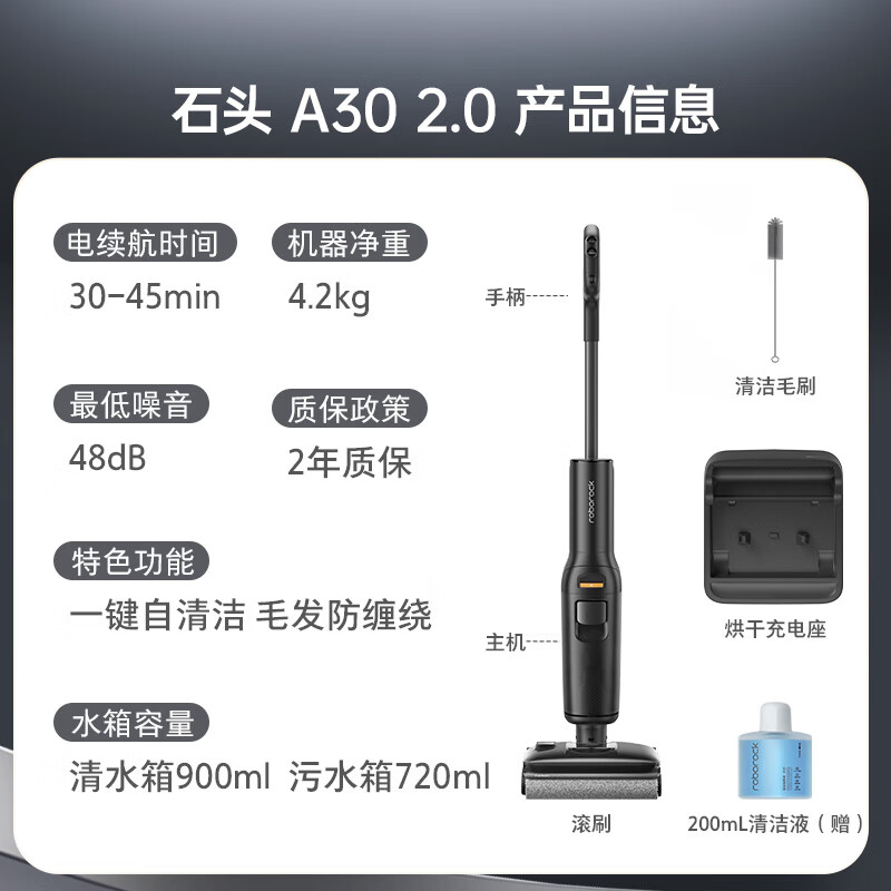 石头A30 2.0 【25000pa飓风吸力】0缠毛95°C自清洁除菌180°超薄躺平洗地机扫地机机器人