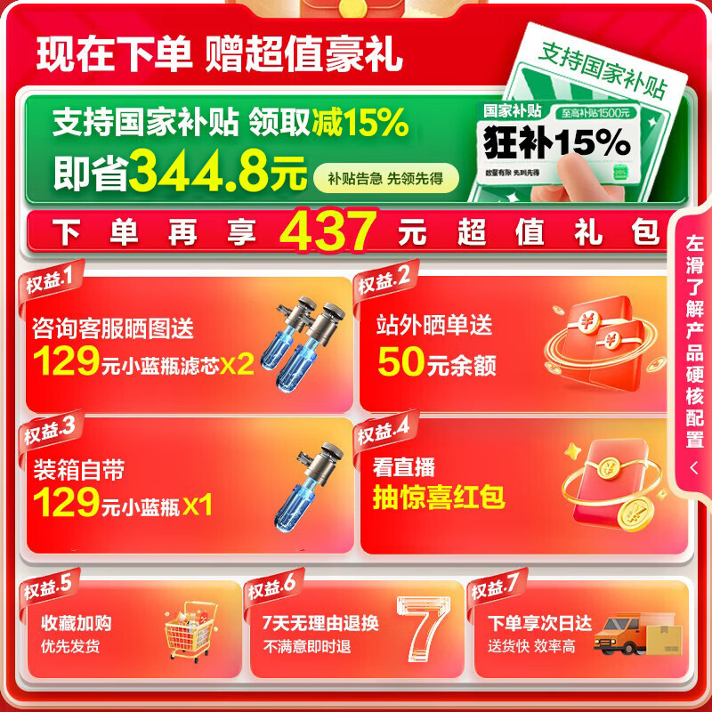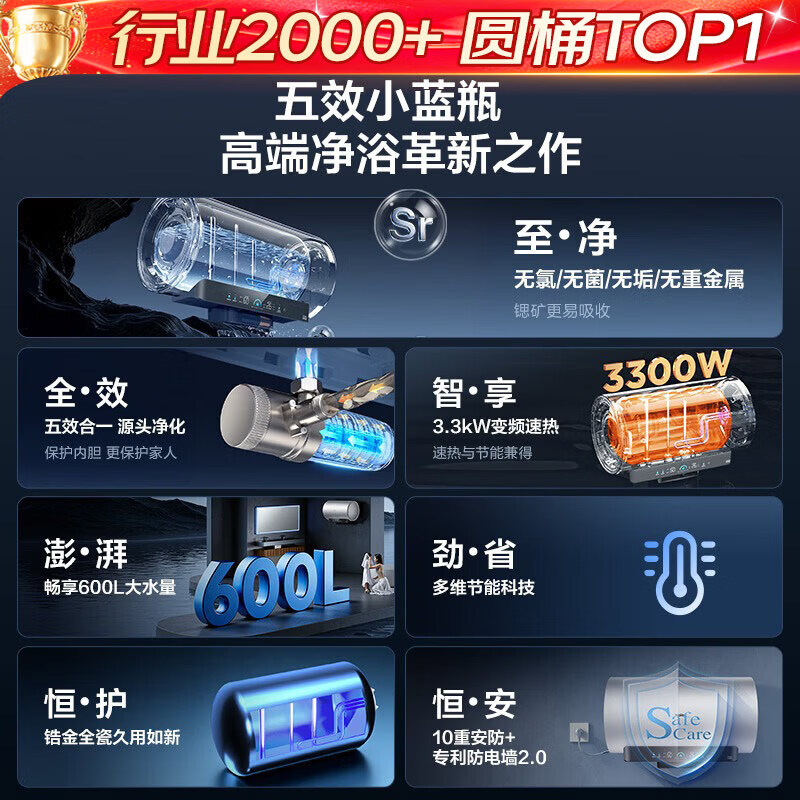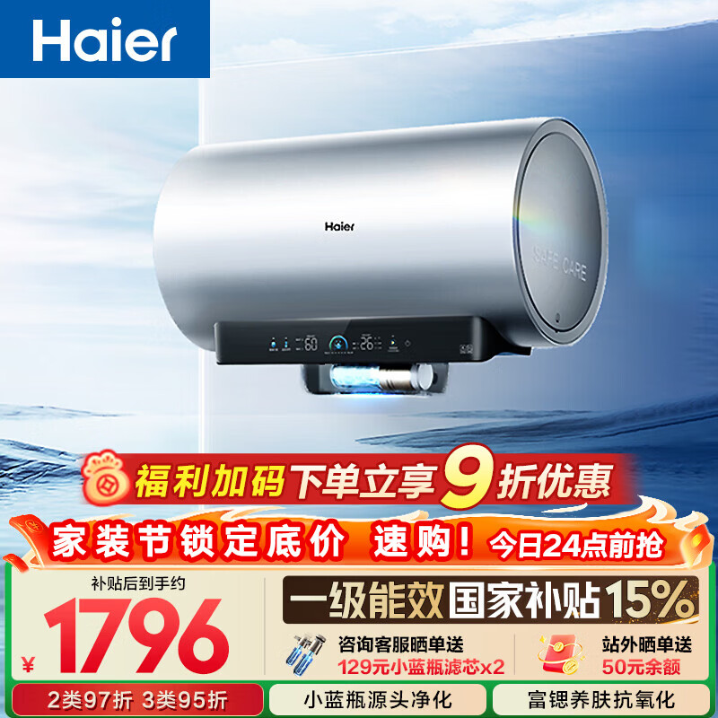 海尔麦浪【小蓝瓶净肤洗DR7】电热水器60升 国家补贴 富锶汤泉 3300W变频一级能效节能速热大水量家用