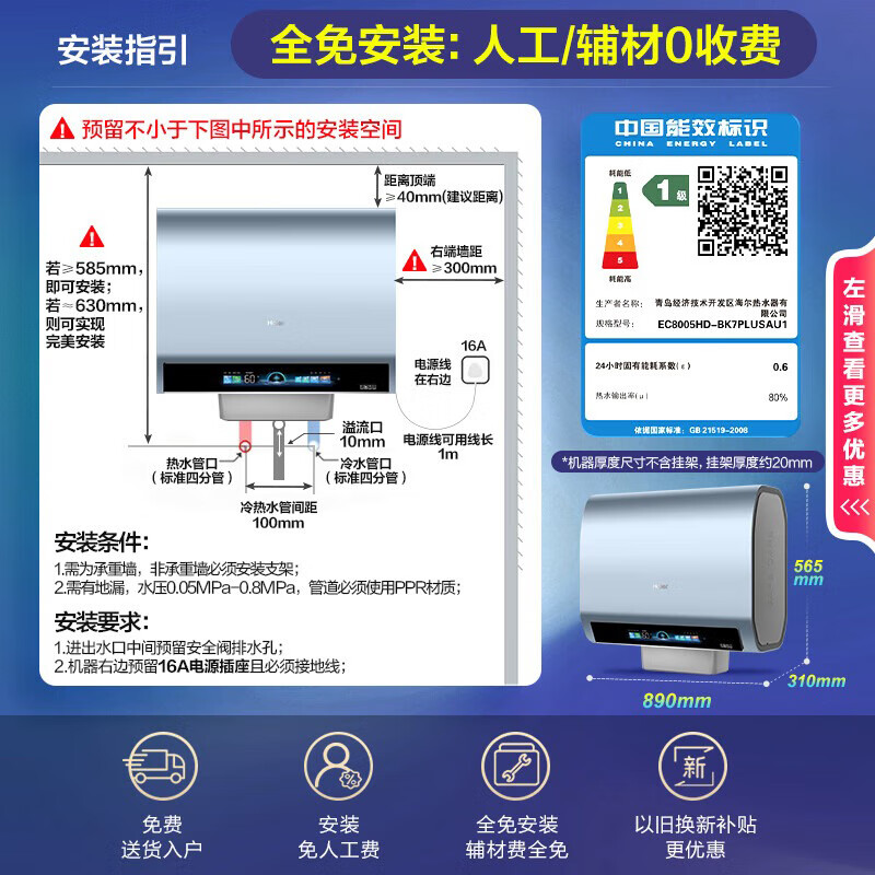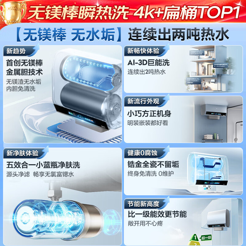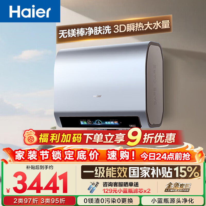 海尔麦浪【无镁棒BK7PLUS】电热水器80升 国家补贴双胆扁桶 BK7升级小蓝瓶净肤洗3D巨能洗速热家用