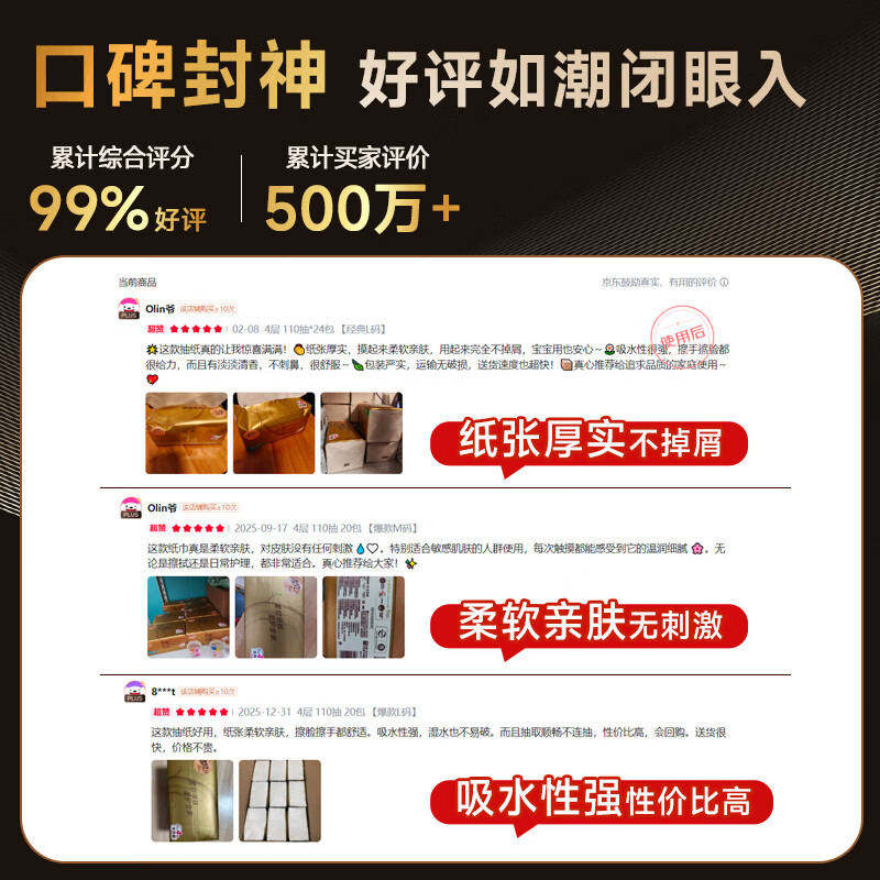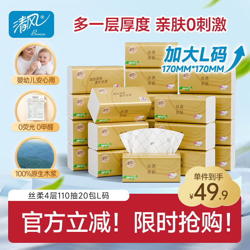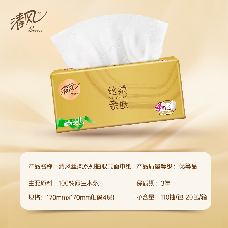 清风抽纸 丝柔4层110抽20包L码 纸巾卫生纸 餐巾纸纸抽 面巾纸 整箱装