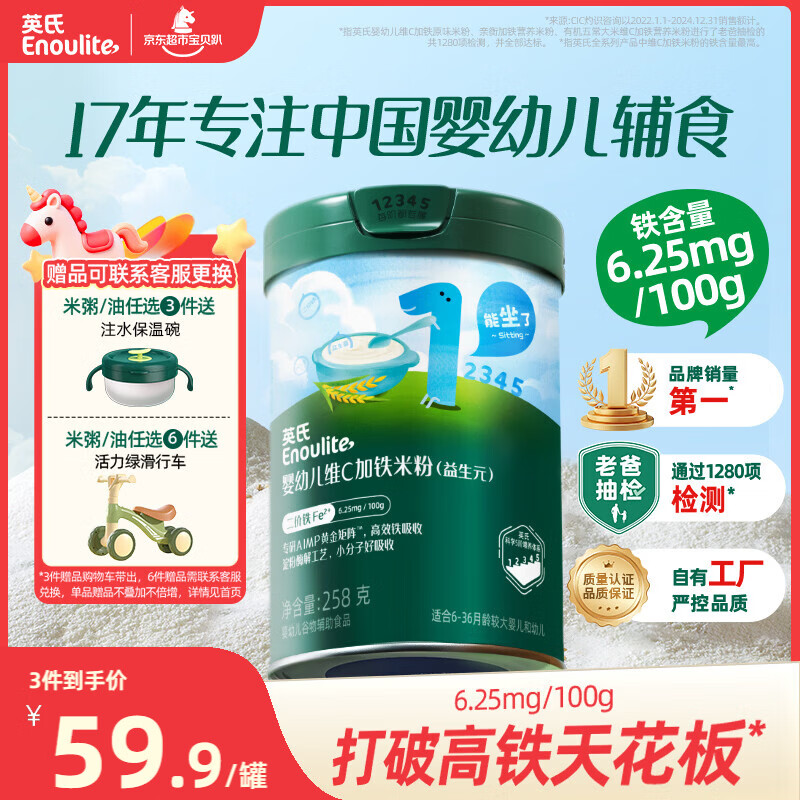 英氏婴幼儿维C加铁益生元米粉258g多乐能营养宝宝辅食高铁米糊1阶6月+