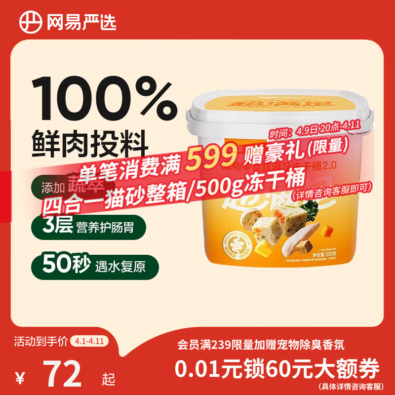 网易严选冻干桶鸡肉宠物零食100%鲜肉蛋黄五拼猫狗通用 呵护肠胃 500g