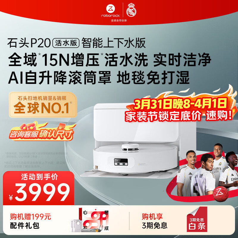 石头(roborock)扫地机器人扫拖一体 P20 活水版 自动上下水版 滚筒洗地机器人 热水洗拖布擦地拖地吸尘器 A2440RR