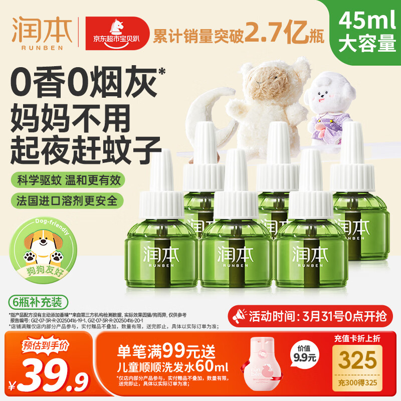 润本蚊香液电蚊香液驱蚊液45ml*6瓶驱蚊防蚊补充装(无蚊香加热器)