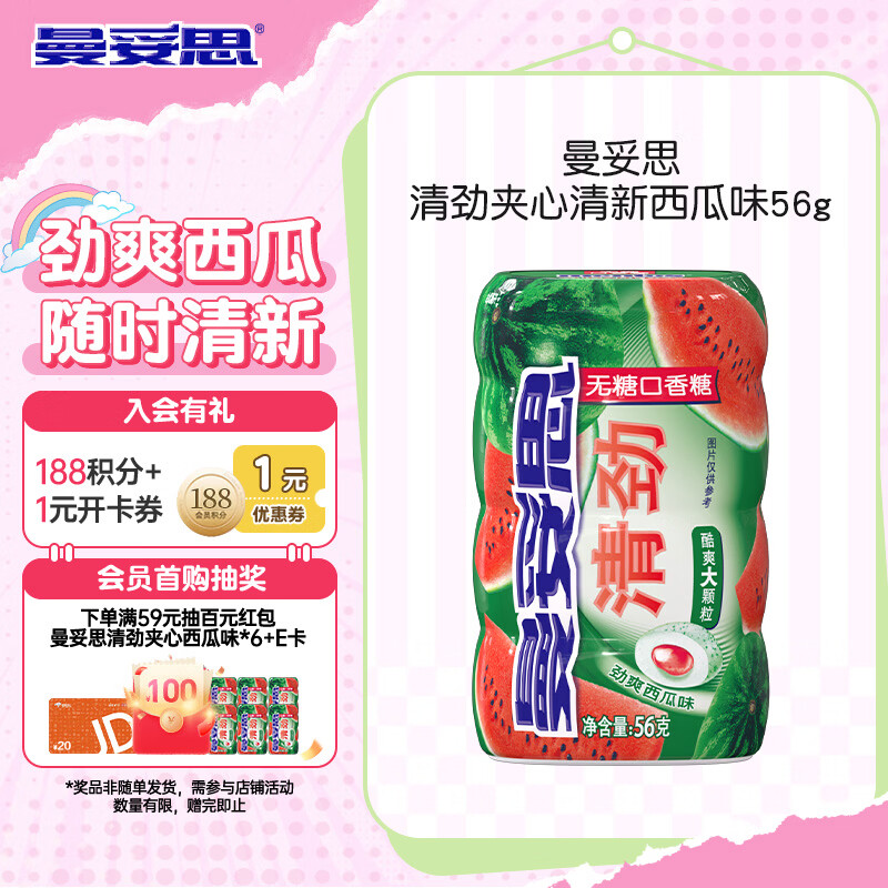 曼妥思 清劲夹心清新西瓜味口香糖56g 约28颗 休闲零食无糖口香糖