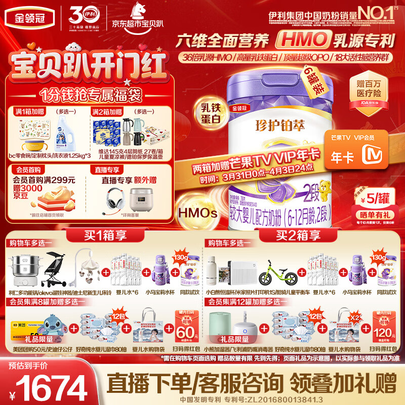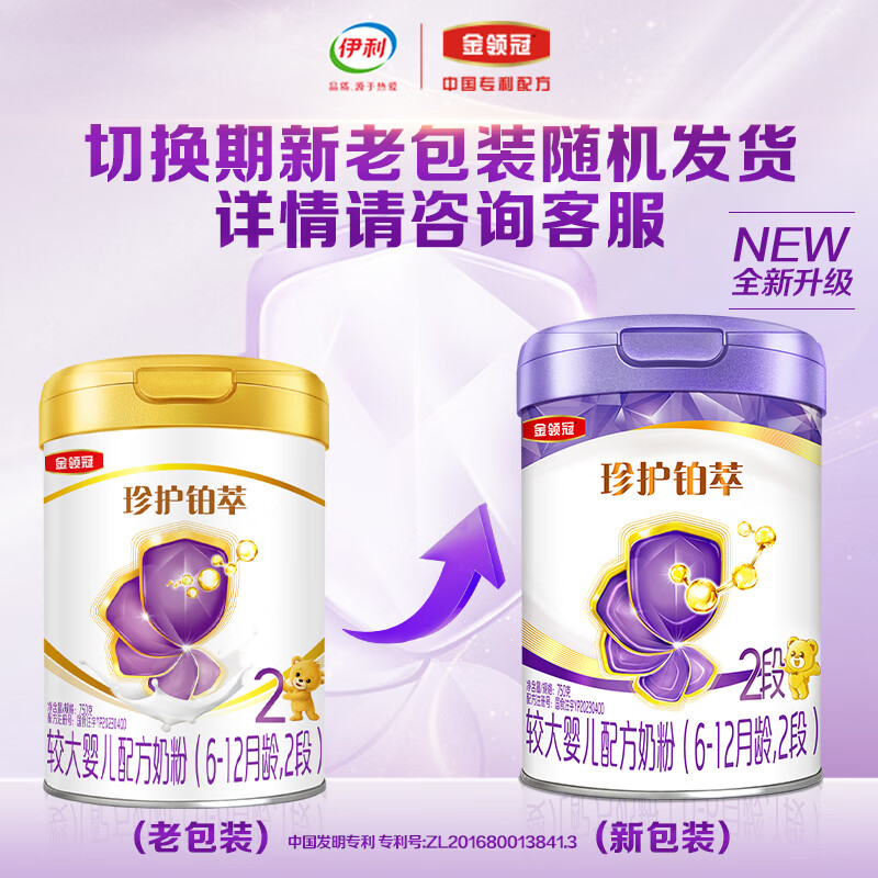 伊利金领冠珍护铂萃较大婴儿奶粉2段(6-12月)750g*6罐 超凡乳源HMOs