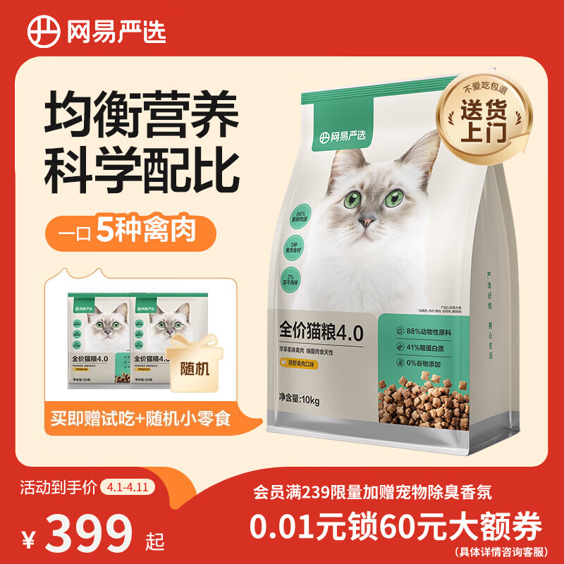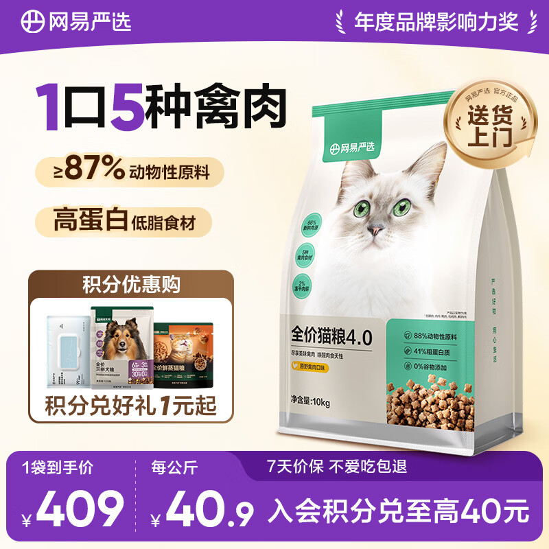 网易严选全价猫粮4.0 宠物主粮成幼猫无谷鲜肉美毛护肠胃 鸡鸭禽肉味10kg