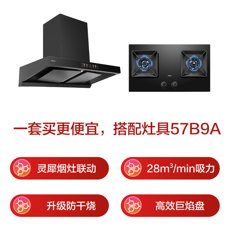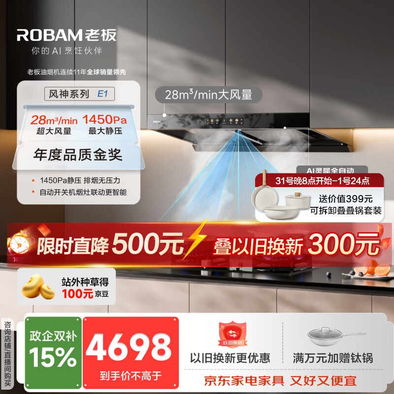 老板【风神E系列】E1油烟机欧式顶侧双腔抽油烟机一级能效国家补贴以旧换新28吸力E1+57B9A天然气套装