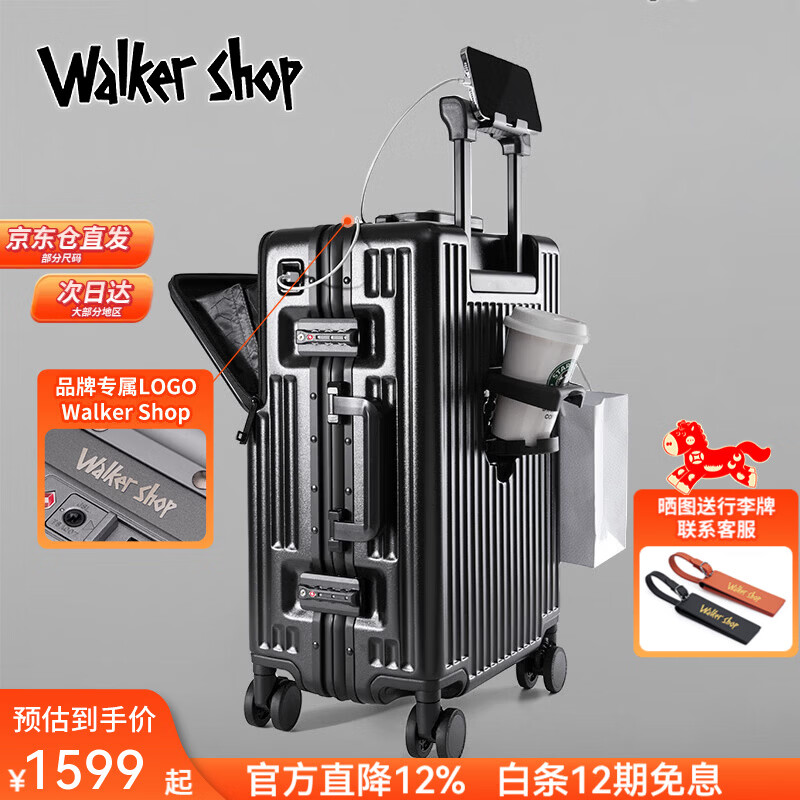 Walker Shop轻奢品牌行李箱铝框登机箱男前开盖多功能拉杆箱密码旅行箱 黑色 24英寸