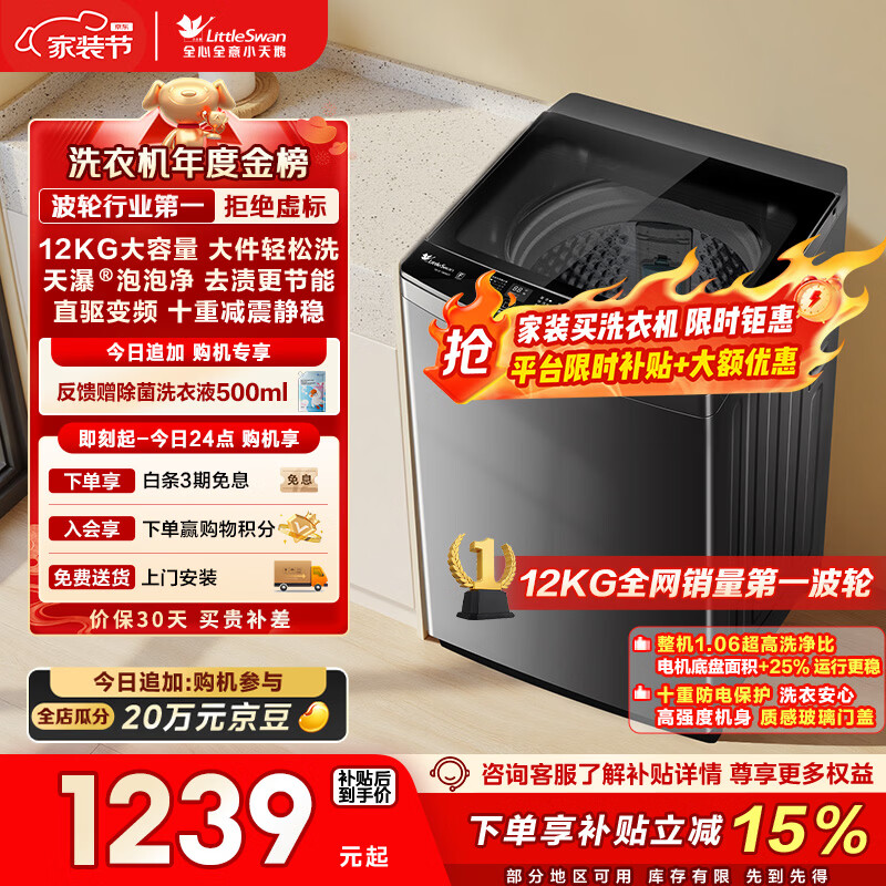 小天鹅(LittleSwan)波轮洗衣机全自动家用 12KG大容量 直驱变频 TB12-1809DT 以旧换新 国家补贴 京东自营 一级能效