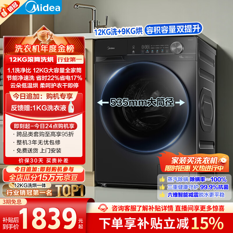 美的(Midea)简尚 滚筒洗衣机全自动 带烘干洗烘一体 12公斤大容量 1.1洗净比 MD120V36T 以旧换新 补贴