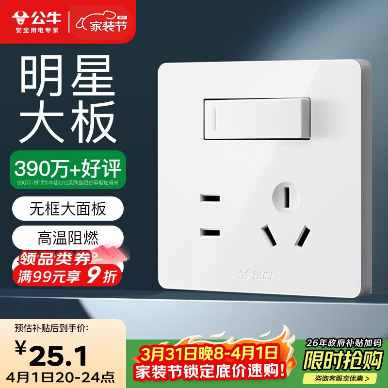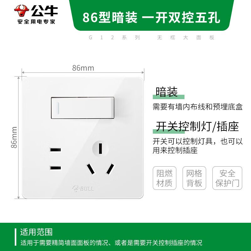 公牛(BULL)开关插座 G12系列一开双控五孔带开关插座86型面板G12E334S象牙白
