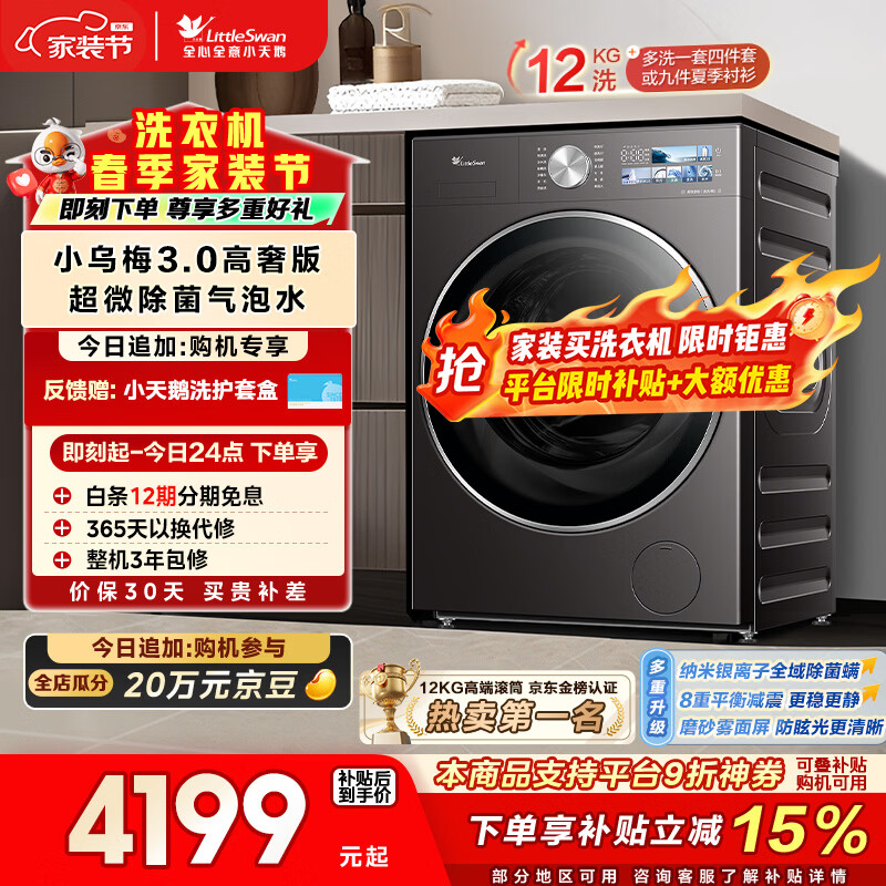 小天鹅(LittleSwan)小乌梅3.0高奢版 滚筒洗衣机全自动 12KG纯平大容量 TG12VE40PRO 以旧换新 京东自营