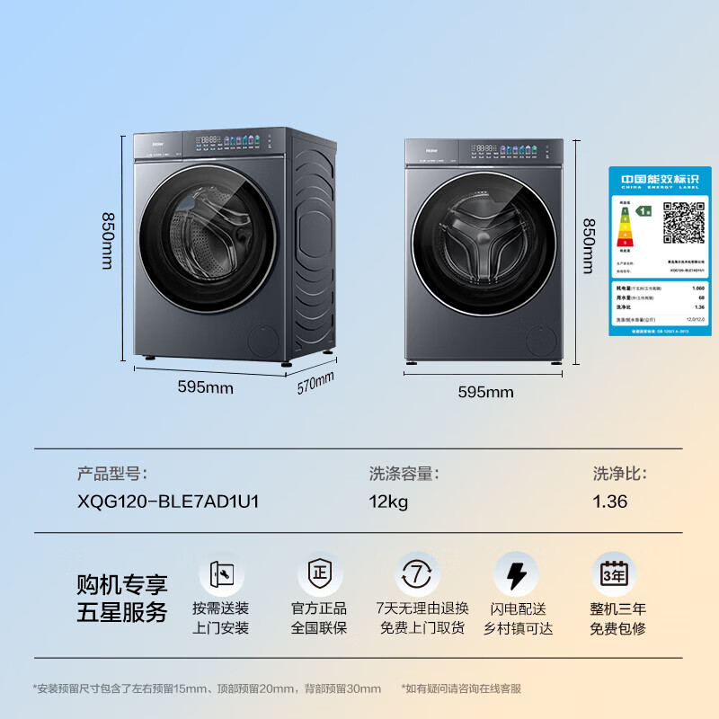 海尔(Haier)云溪5.0 AWE同款 滚筒洗衣机全自动单洗家用 12公斤超薄 家电国家补贴以旧换新 京东自营直驱7AD1