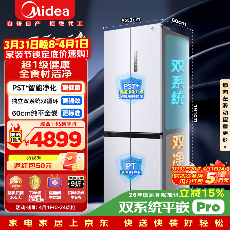 美的(Midea)M60小机皇515升十字门冰箱超薄嵌入式双系统大容量以旧换新MR-541WUSPZE国家补贴520姐妹