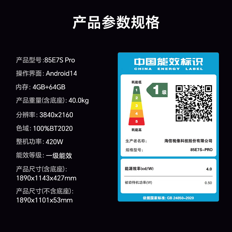 海信RGB-MiniLED电视E7S Pro 85吋 玲珑真彩背光 信芯芯片 黑曜屏Pro 高刷 国家补贴E7Q升级世界杯定制