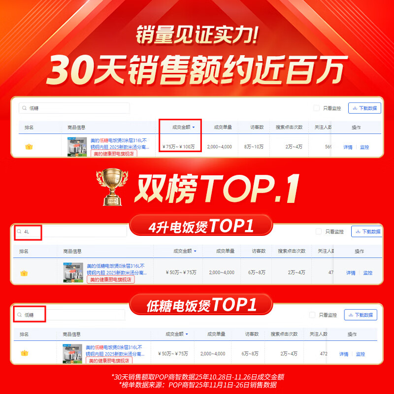 美的低糖电饭煲0涂层316L不锈钢内胆 新款米汤分离电饭锅4-5-6-8人 多功能柴火饭 米种选择煮饭锅 4L