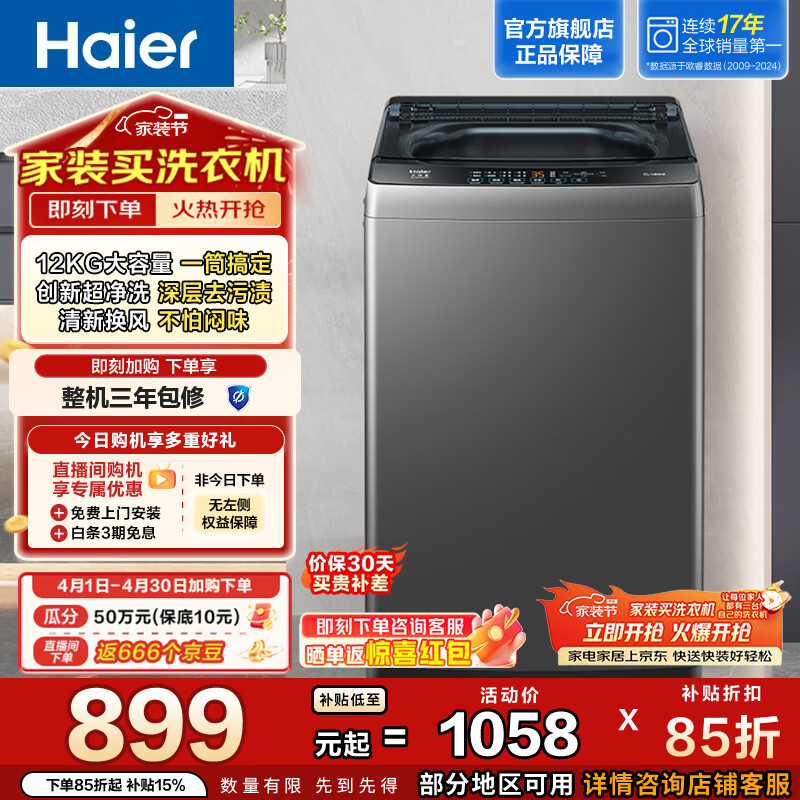 海尔(Haier)全自动波轮洗衣机12KG 家用大容量 升级除螨抗菌全桶换风 懒人强力洗 家电换新补贴Z33Mate1