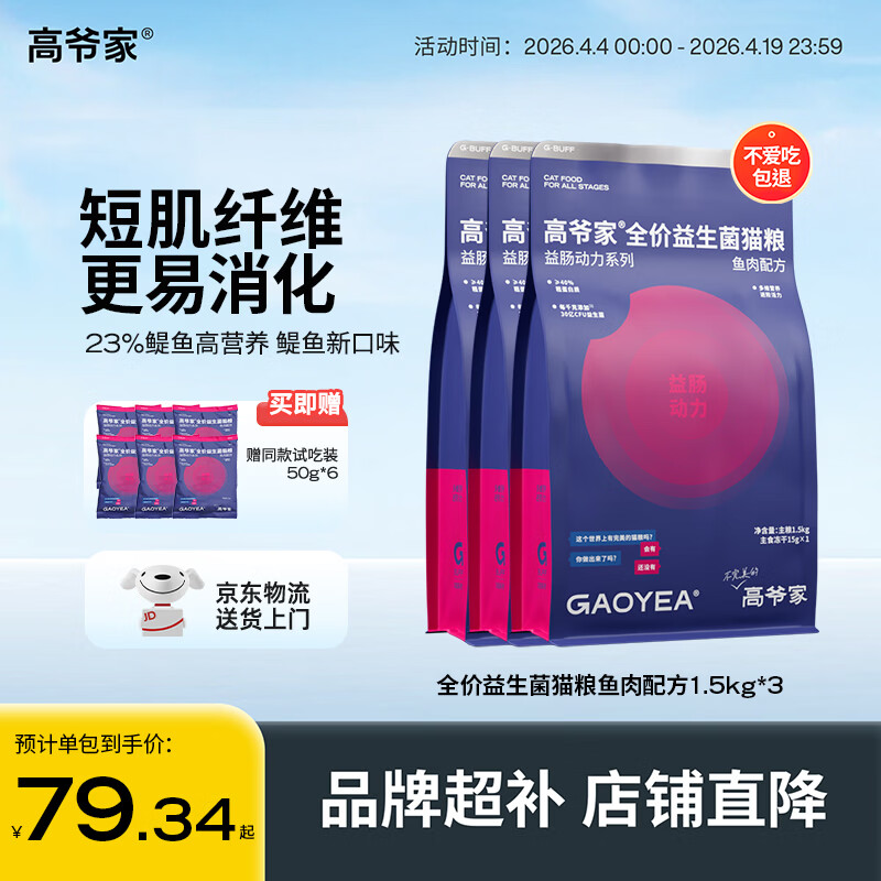 高爷家全价益生菌 高肉冻干 易消化 鱼肉益生菌猫粮1.5kg*3包