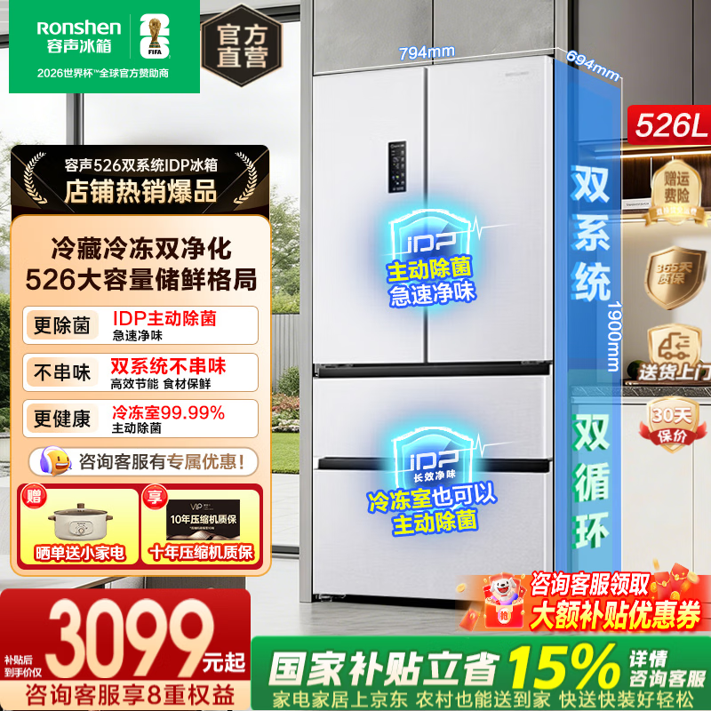 容声【国家补贴】526升双净双系统法式多门四开门电冰箱家用一级节能效风冷无霜变频大容量IDP除菌 容声526升双净双系统除菌冰箱