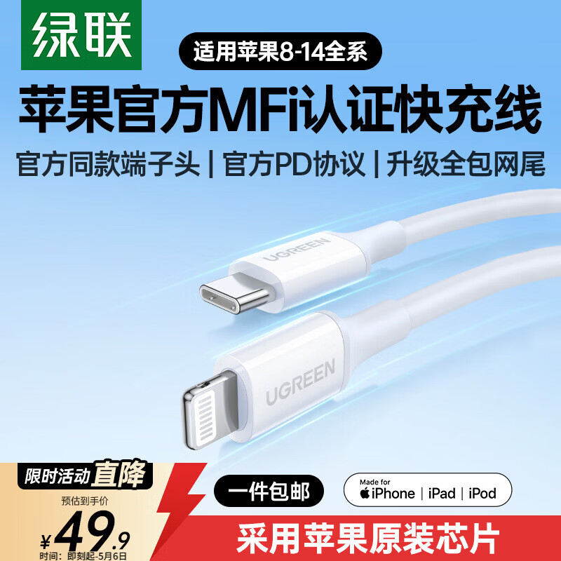 绿联【官方MFi认证】适用苹果14/13充电线Type-C数据线PD60/30/20W快充Lightning闪电接口iPhone手机
